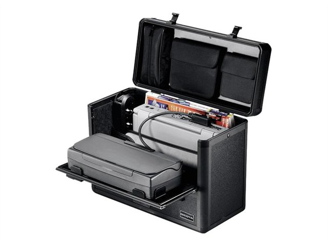 DataBox Profile 15" est une malle fonctionnelle en aluminium pour tous les ordinateurs portables courants et imprimantes Canon, Olivetti et HP DJ 450. Le boîtier robuste et la matelassure au fond du compartiment pour ordinateur portable garantissent un maximum de protection de l'équipement informatique mobile. Pour le travail, l'ordinateur portable est tiré de la malle tandis que l'imprimante reste à l'intérieur, la malle étant posée au sol (principe du sol-table de travail). L'imprimante est fixée sur le volet frontal rabattable pour le travail. Documents et blocs d'alimentation sont bien rangés dans des compartiments individuels. Le câblage se trouve au coeur de la malle et l'alimentation en courant s'effectue par une prise multiple incluse faisant partie intégrante de la livraison. La poche de rangement dans le couvercle de la malle fournit une place supplémentaire aux accessoires mobiles. La fixation "QuickFix", appropriée aux imprimantes Canon, Olivetti et HP DJ 450, est en option.
