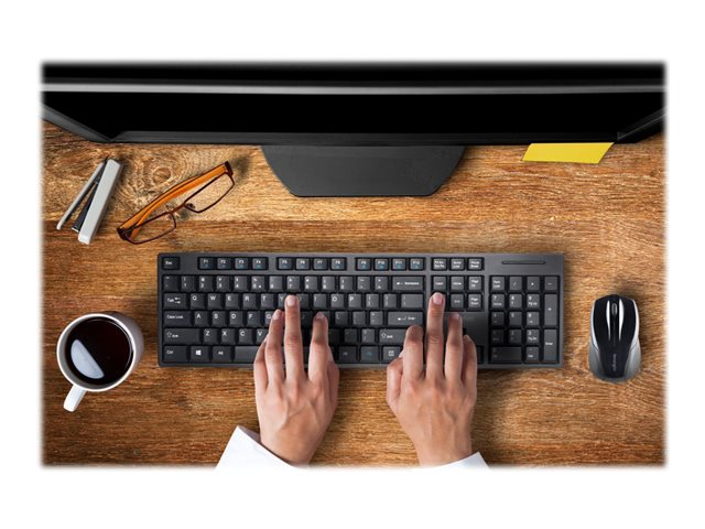 Le kit de bureau sans fil compact Kensington Pro Fit est une solution fiable pour poste de travail professionnel. Avec son clavier de taille standard résistant aux éclaboussures, ses touches multimédia, sa souris ambidextre confortable et une protection par chiffrement AES, le kit de bureau sans fil compact Pro Fit vous permet de configurer un poste de travail sécurisé et parfaitement rangé.