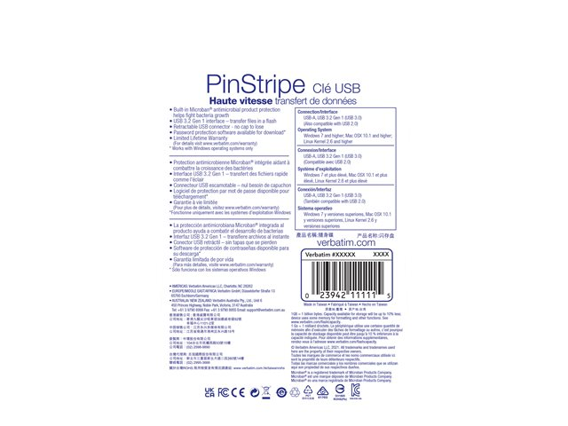 Portable et rapide, idéale pour tous vos besoins de stockage ! Les clés USB PinStripe de Verbatim permettent de stocker et d'organiser vos fichiers importants rapidement et facilement. La conception pratique sans capuchon avec boîtier rétractable protège le connecteur USB et se glisse facilement à l'intérieur et à l'extérieur. L'interface USB 3.2 Gen 1 offre des vitesses de transfert de données supérieures à celles de l'USB 2.0, ce qui facilite le transfert de plusieurs fichiers à la fois ou de fichiers plus volumineux sans erreur. Pas de ports USB 3.2 Gen 1 ? Pas de problème ! Cette clé est rétrocompatible avec les ports USB 2.0. Ces clés USB Verbatim intègrent la protection antimicrobienne Microban. Cette technologie antimicrobienne aide à prévenir la prolifération des bactéries, ce qui permet de garder vos clés USB plus propres !