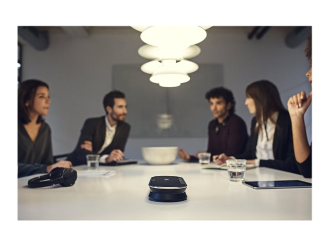 Fédérez vos collègues grâce à un speakerphone évolutif premium Bluetooth adapté pour des réunions jusqu'à 16 personnes, en présentiel. Faites-vous clairement comprendre grâce à six microphones adaptatifs dotés d'une technologie de formation automatique de faisceaux qui isolent les voix humaines des effets de la réverbération et des bruits ambiants. Profitez d'un speakerphone supérieur au son remarquable et naturel.